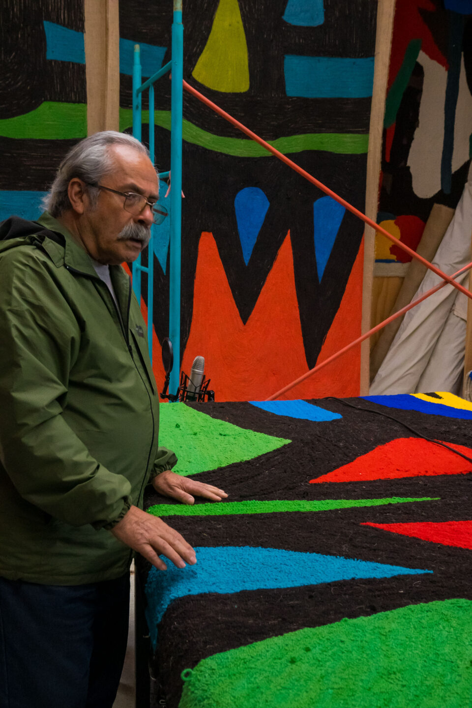 Este mural textil ha sido desarrollado por el artista en conjunto al taller textil Malfatti en la localidad de Cahuil, Pichilemu, con el apoyo del Ministerio de las Culturas, las Artes y los Patrimonios, Fondart 2025.