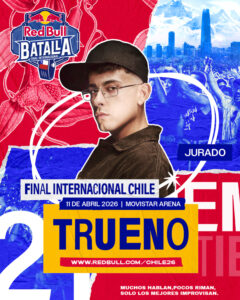 A solo días de la Final Internacional de Red Bull Batalla, ya se conocen a los encargados de impartir el criterio en la ronda de batallas que definirá al flamante campeón mundial de freestyle. El cantante argentino Trueno, vuelve a subirse a la tarima de un evento de esta magnitud pero esta vez, no como competidor, sino siendo parte del jurado junto a Jota, Jony Beltrán, Arkano y Yartzi.